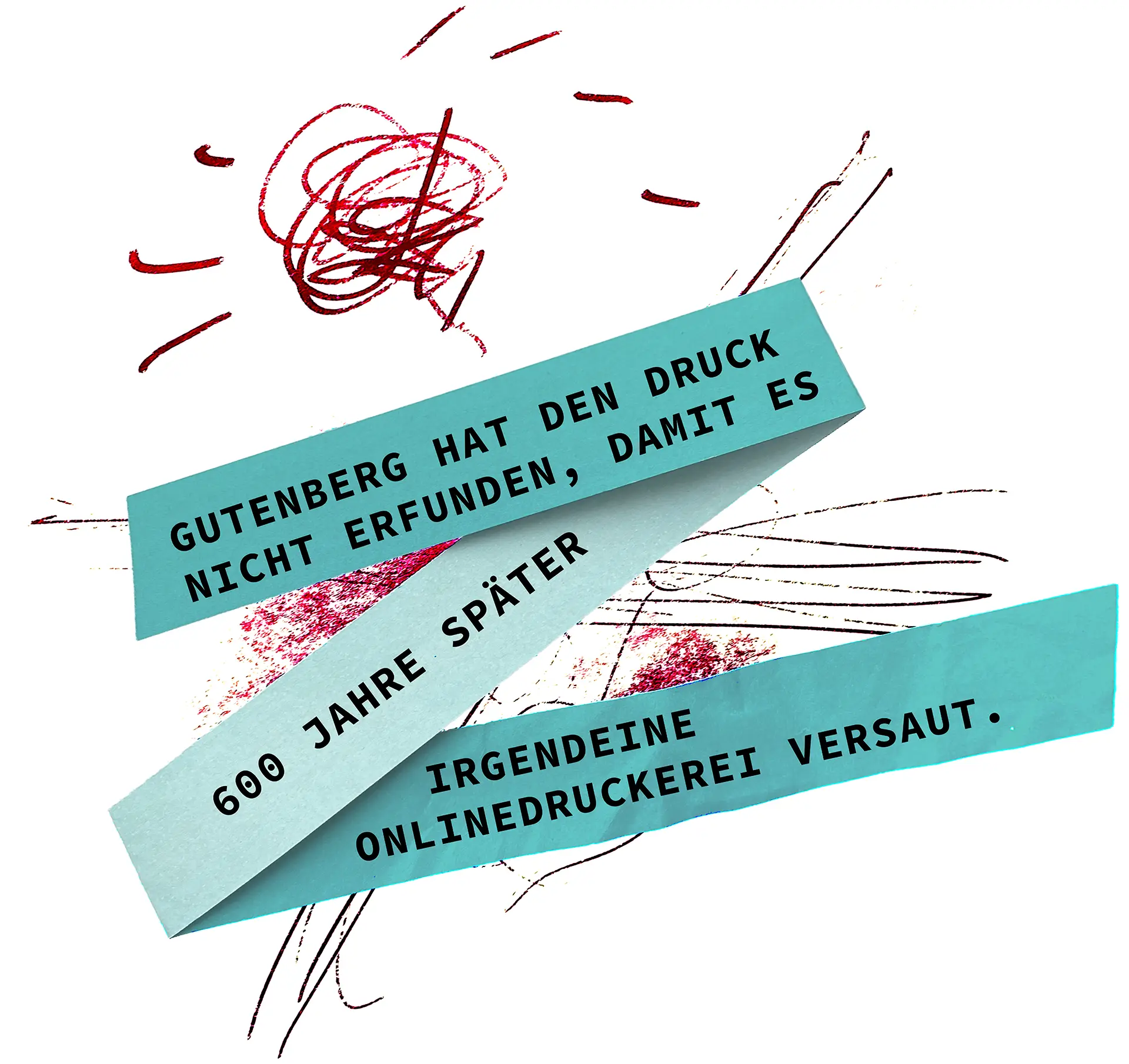 Nix von der Stange. Von Mensch zu Mensch. Druck ist immer noch echtes Handwerk. Weil gute Preise eben nicht von „Hauptsache billig und dann wird’s halt doch Kacke“ kommen.